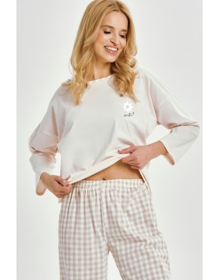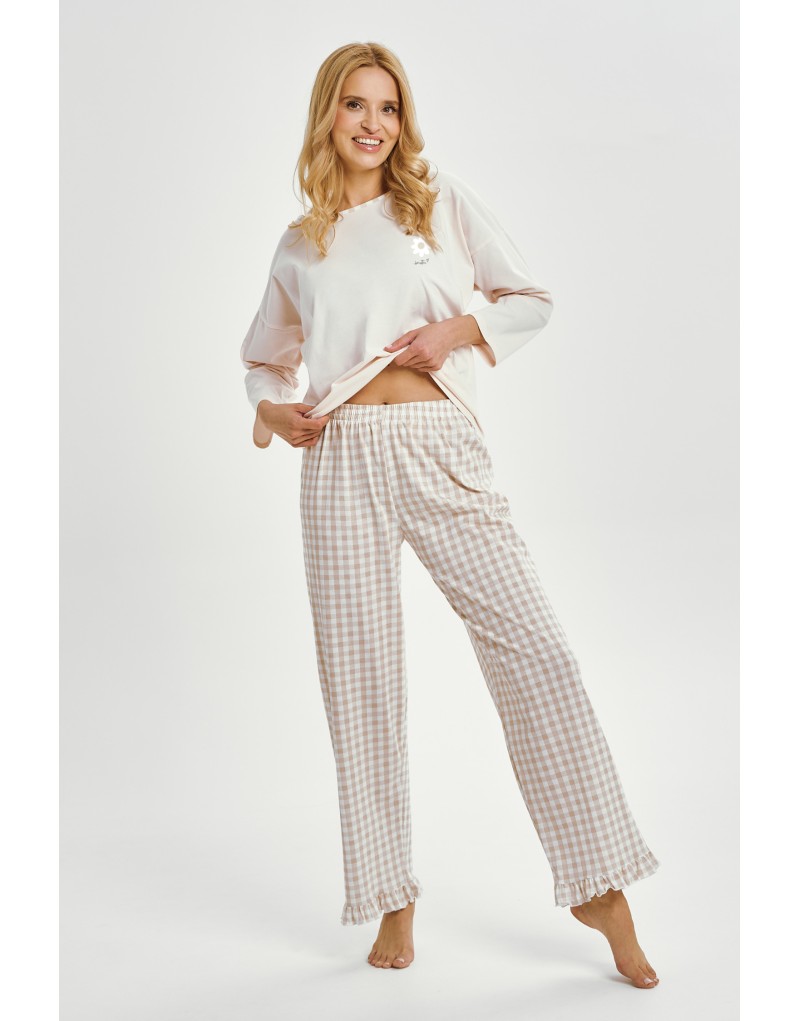 Piżama damska VERA to idealne połączenie wygody i kobiecego stylu. Wykonana w całości z wysokogatunkowej, 100% bawełny, jest miękka, przewiewna i przyjemna dla skóry. Gładka koszulka z długim rękawem ozdobiona została subtelnym nadrukiem na piersi. Uzupełniają ją długie spodnie w drobną kratkę, których nogawki wykończone są dekoracyjną falbanką. Elastyczna gumka w pasie zapewnia wygodne dopasowanie bez ucisku. Komplet idealny na nocny odpoczynek lub wieczorny relaks w domowym zaciszu.