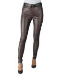 Spodnie damskie o klasycznym kroju, wykonane z eco skóry, woskowane. Wysoka jakość  materiału idealnie imituje skórę, przepuszcza  powietrze, bardzo miły w dotyku i wygodny w noszeniu.  Materiał bardzo elastyczny, doskonale dopasowuje się do kobiecej sylwetki, ładnie ją eksponuje i podkreśla. Model posiada kieszenie z przodu i z tyłu, zapinany na guzik i zamek.